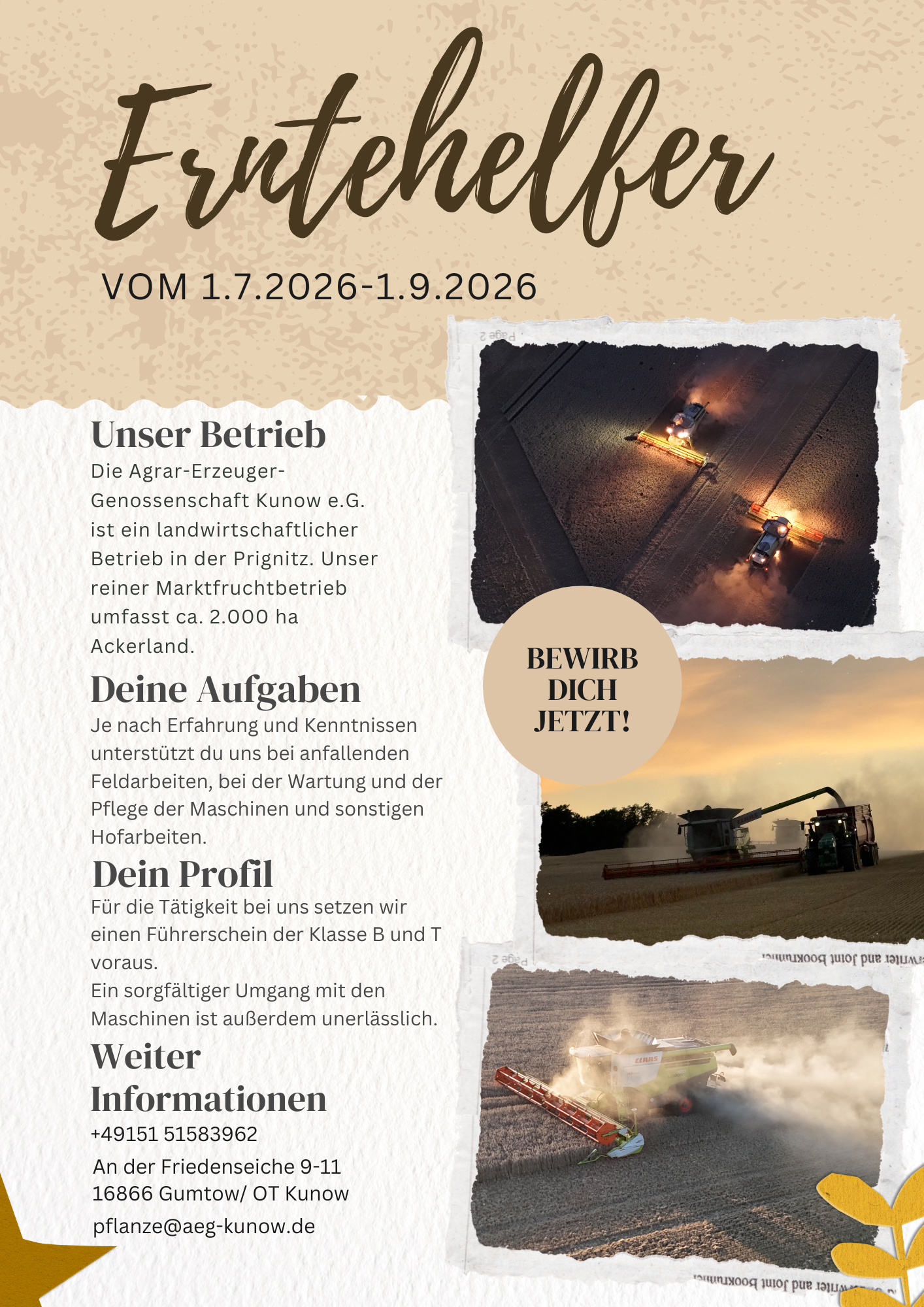 BB - Agrar-Erzeuger-Genossenschaft Kunow eG, Erntehelfer 2026 (15.01.2026)
